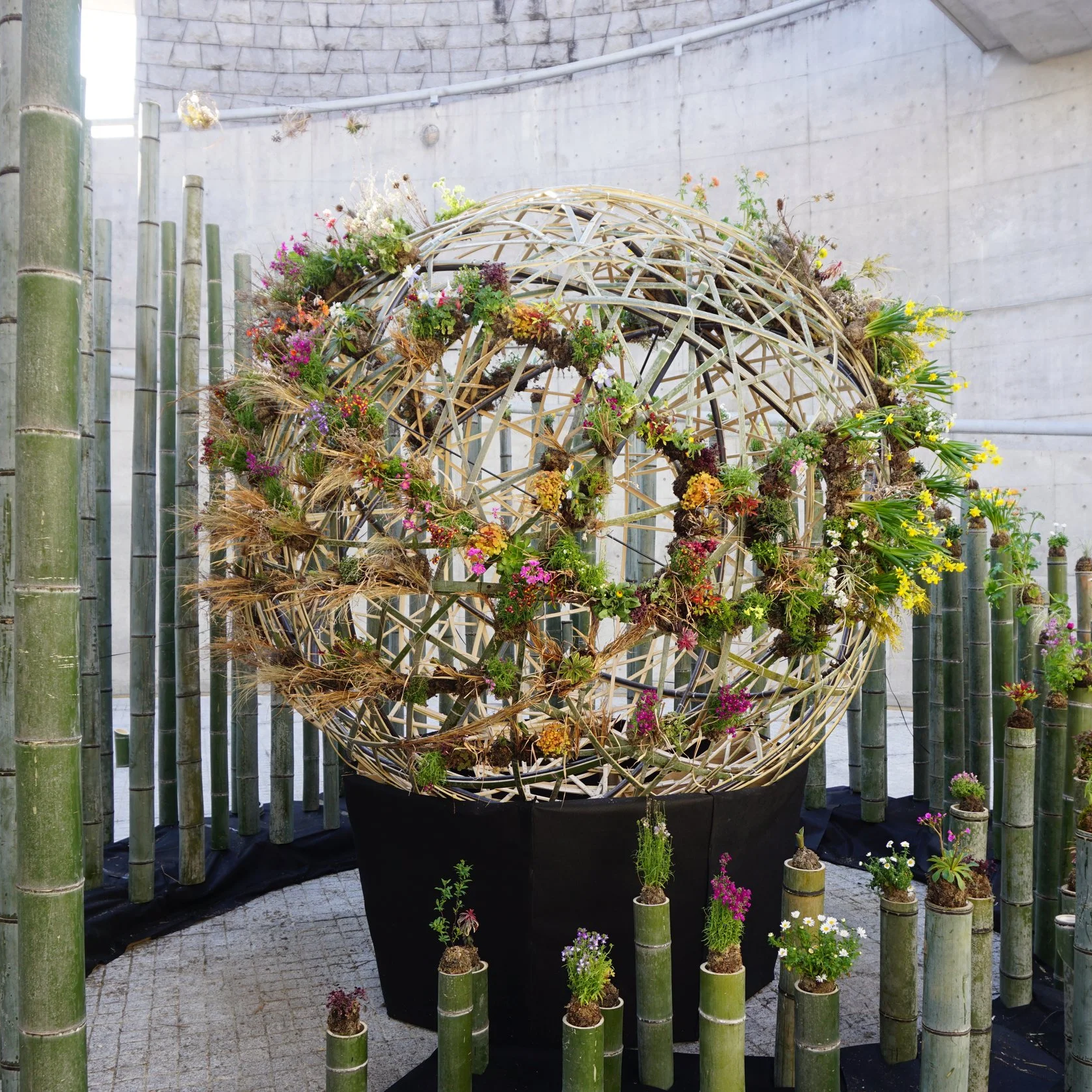 Floral display as part of installation designed by Akito Yamamote with bamboo work by Akihiro Mashimo