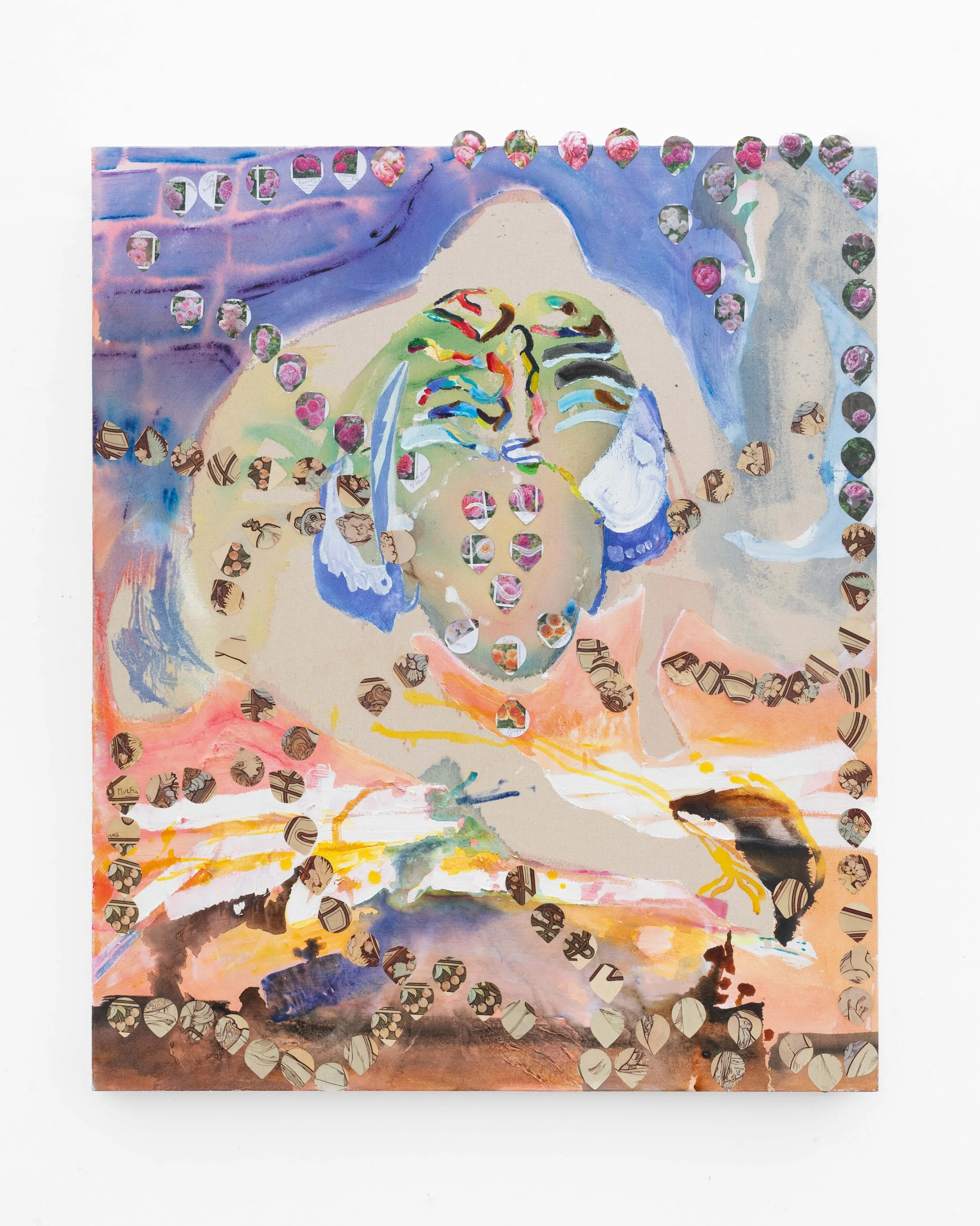 Acrylic, gesso and hand cut milk bottle tops on canvas